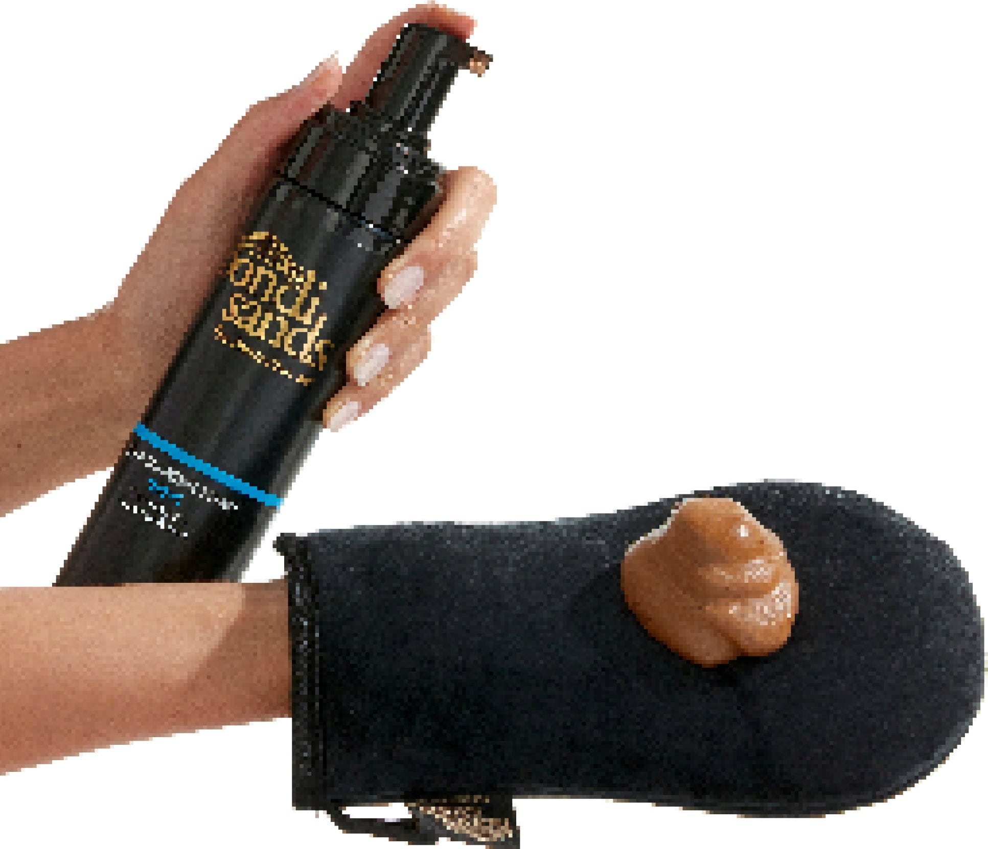 2. Verdeel het zelfbruiner-schuim gelijkmatig over de huid met je handen of met behulp van een applicator. Begin op je benen, armen en lichaam, gevolgd door je gezicht, ellebogen en knieën.