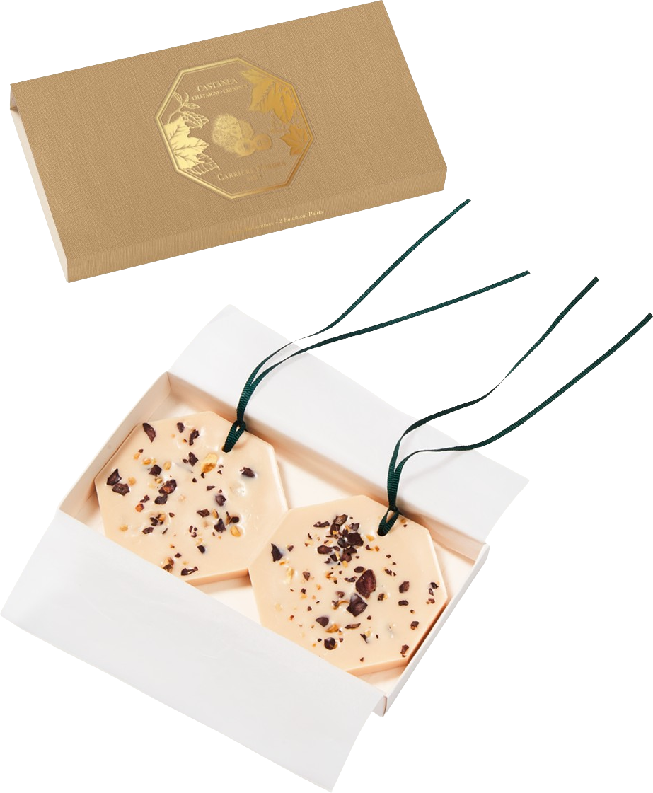 De Botanical Palets Chestnut van Carrière Frères betoveren met hun harmonieuze, lichtzoete geur, die tegelijkertijd een gevoel van rust uitstraalt. Het omhullende aroma van geroosterde kastanjes ontvouwt zich op een aangename manier, terwijl subtiele rokerige tonen van ceder en sandelhout samensmelten met de zoetheid van gedroogde vruchten. De balsemachtige, verwarmende touch van Siam-Benzoin maakt de geur perfect af.