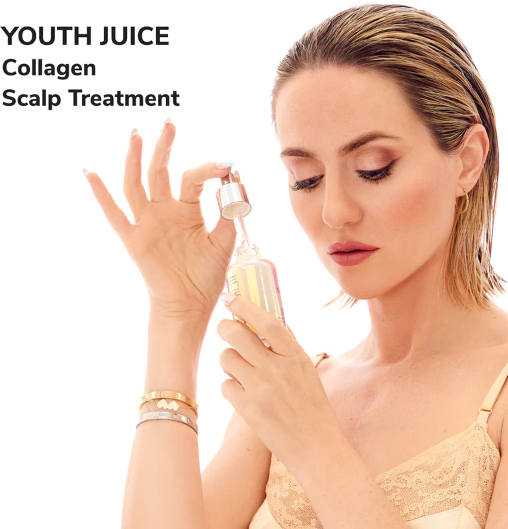 - Breng op schoon, vochtig of droog haar 1-3 druppels van het Youth Juice Collagen Scalp Treatment direct op de hoofdhuid aan