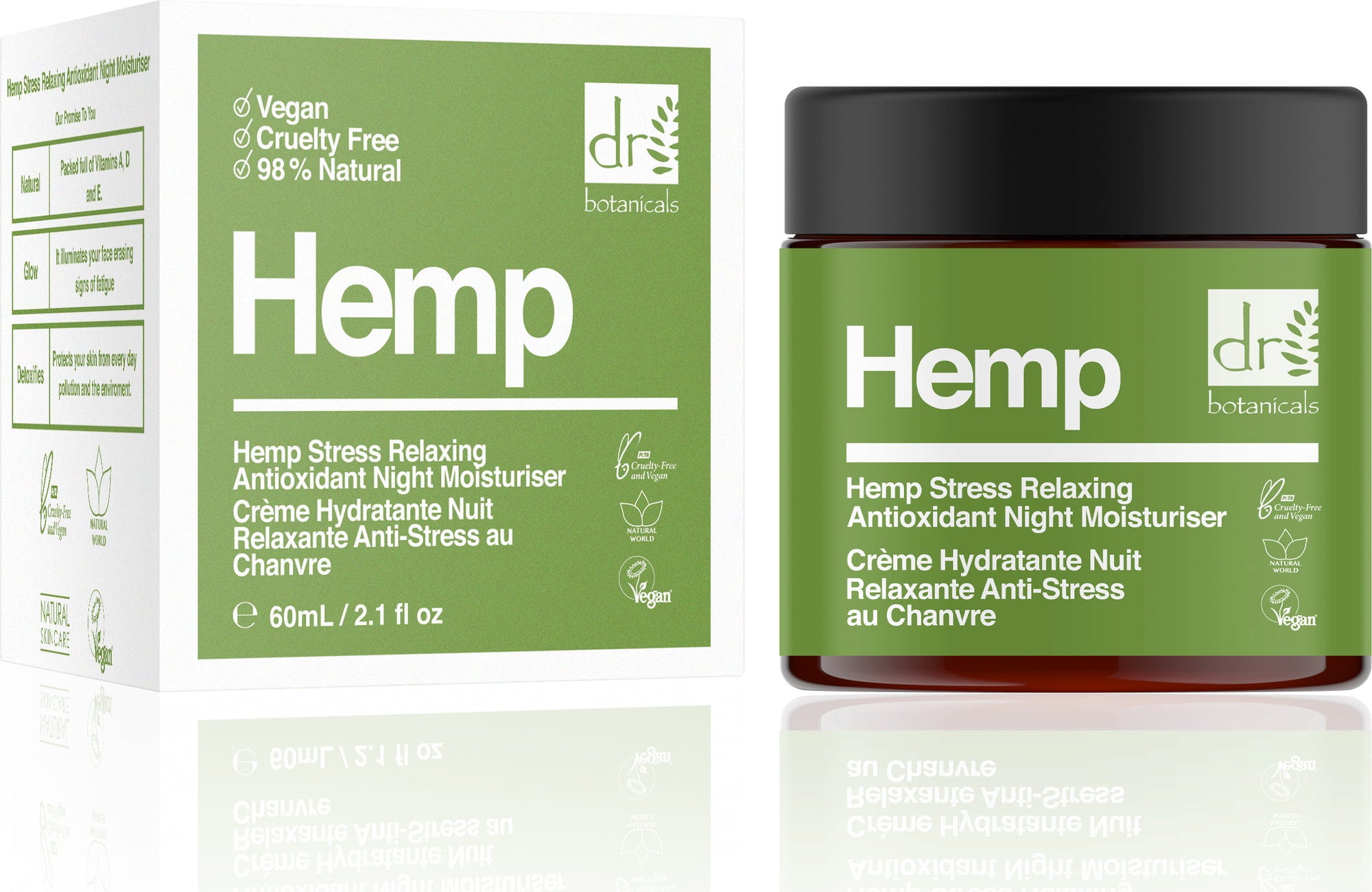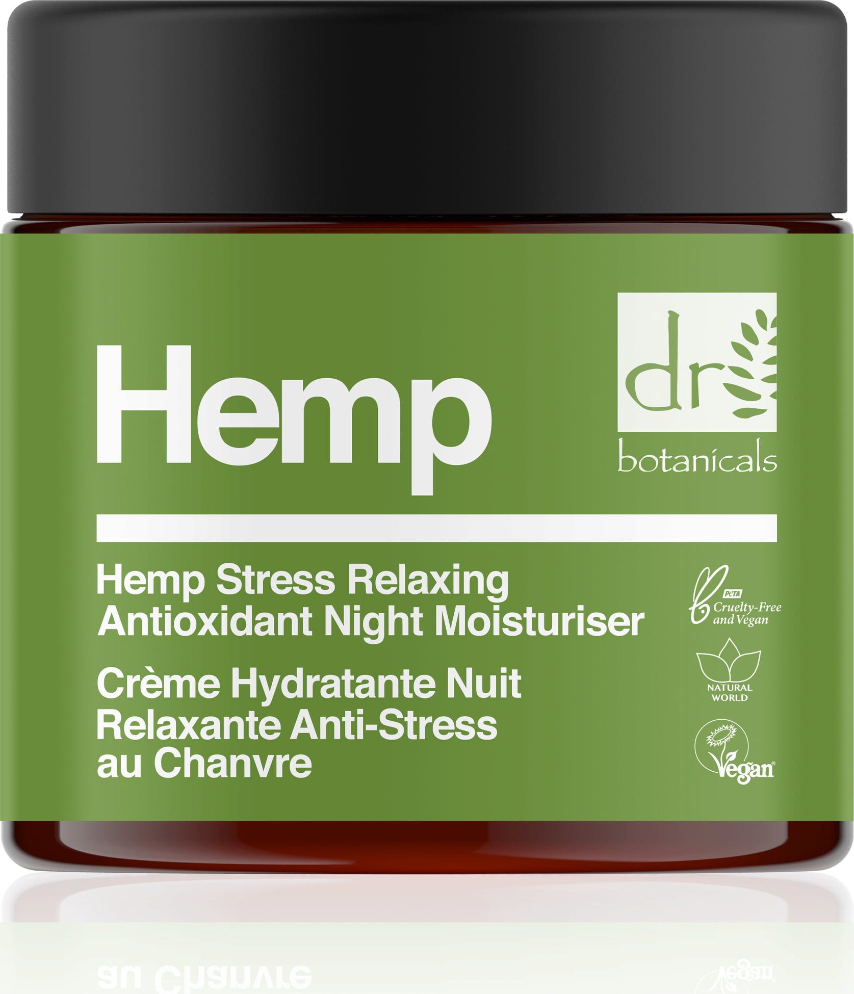 De veganistische nachtcrème Hemp Stress Relaxing Antioxidant Night Moisturiser van Dr. Botanicals.