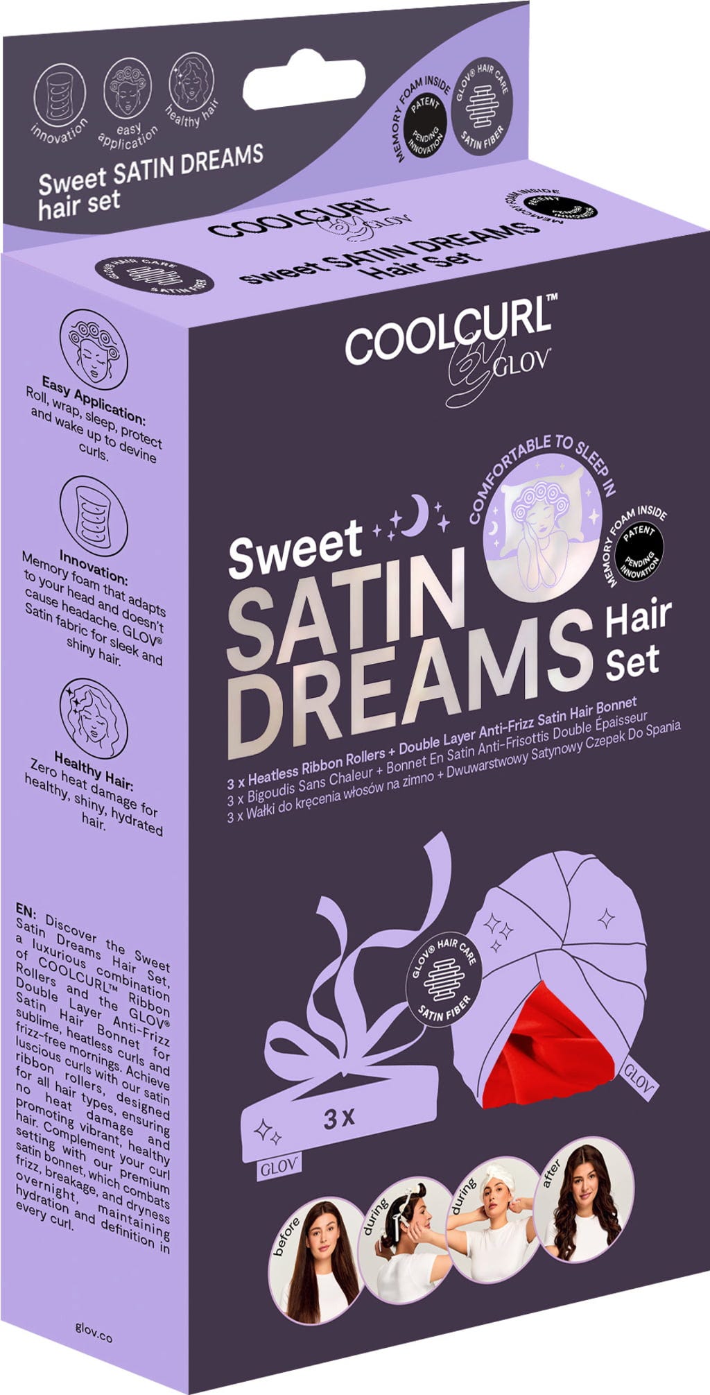 Ontdek de Sweet Dreams Satin Set - een luxe combinatie van de COOLCURL™ Ribbon Rollers en de Double Layer Anti-Frizz Satin Hair Bonnet. Samen beloven ze hittevrije krullen en pluisvrije ochtenden. Ze zijn ontwikkeld voor alle haartypes en zijn bijzonder zacht voor het haar. De satijnen tulband beschermt het haar tegen breken, vochtverlies en pluis en behoudt de definitie van de krullen.