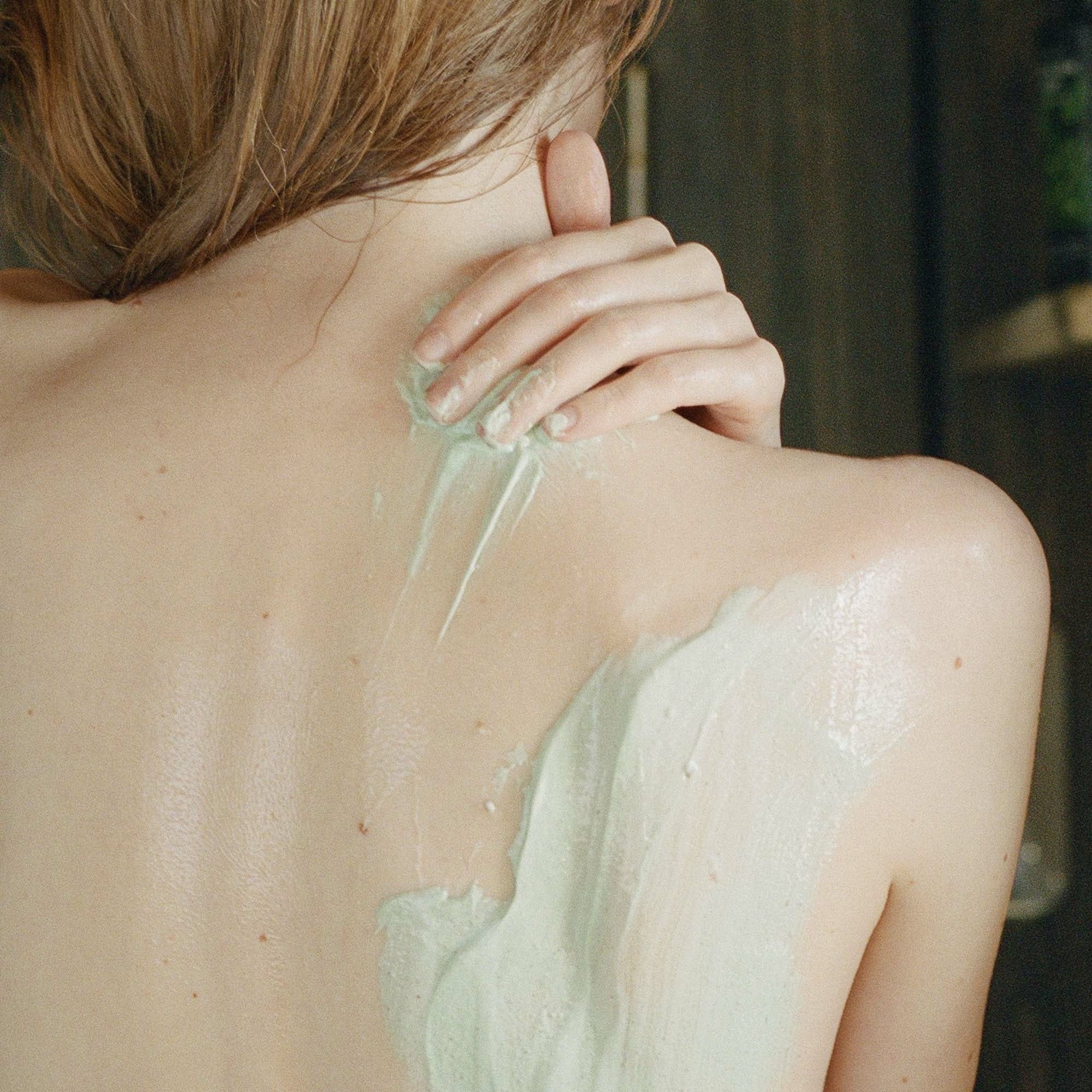 - Maak vervolgens je handen nat en wrijf je huid zachtjes met ronddraaiende bewegingen onder de douche.