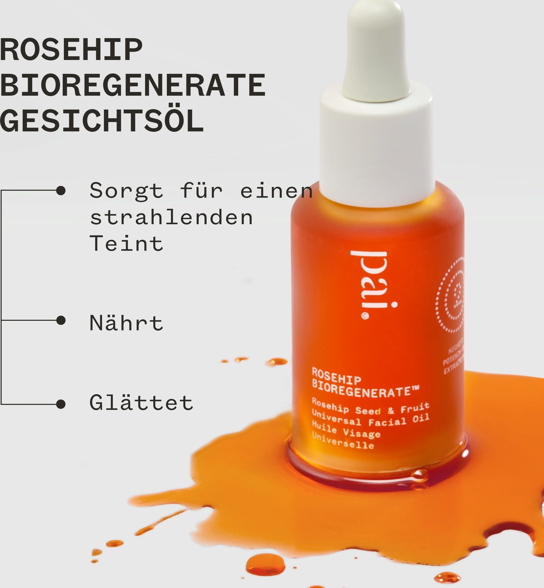 De Bioregenerate Rozenbottelolie is een bijzonder regenererende, universeel toepasbare huidolie en geschikt voor alle huidtypes. Het kan worden gebruikt voor onzuiverheden, droogheid, gebrek aan glans, pigmentvlekken, roodheid en fijne lijntjes. De extracten uit rozenbottelpitten en vruchten worden verkregen door middel van zachte CO2-extractie en bevatten zo de geconcentreerde kracht van de natuur.