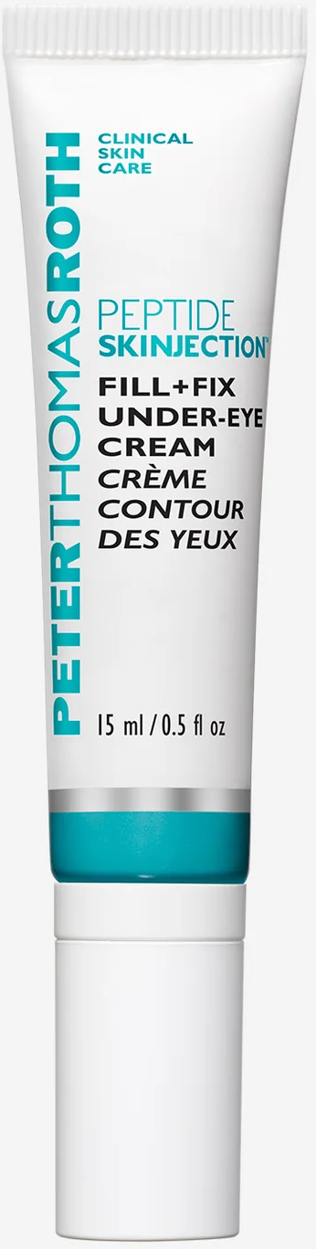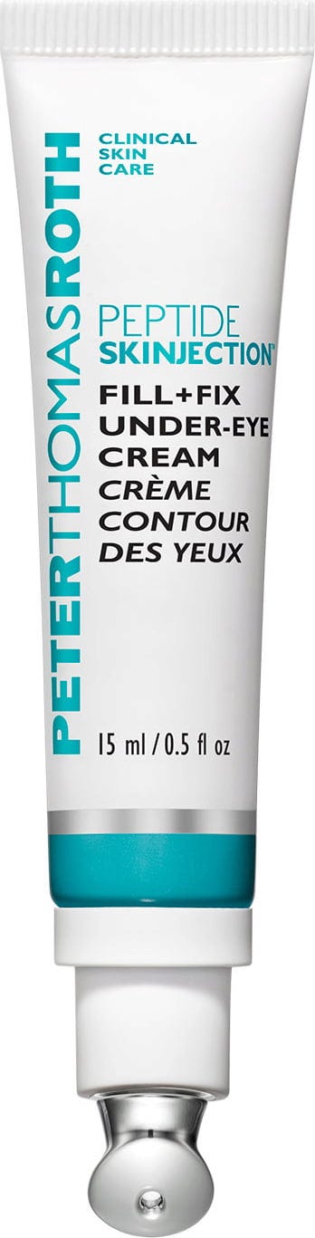 De Peptide Skinjection™ Fill + Fix Under-Eye Cream van Peter Thomas Roth is een niet-invasieve oogcrème die een naaldvrij filler-effect biedt en helpt om donkere kringen, donkere plekken rondom de ogen en fijne lijntjes te minimaliseren. Dankzij de 4% Peptilift-peptidetechnologie, de 3% Juveneye CLR™ en de hyaluronzuurvulbolletjes zorgt de formule ervoor dat de oogcontouren strakker, steviger en stralender ogen en wordt het volume hersteld. Verrijkt met oplichtende mineralen en cafeïne zorgt de crème voor een frisse blik bij alle huidtinten.