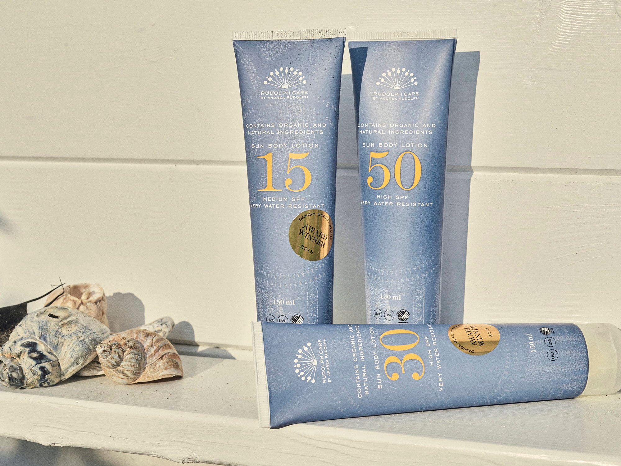 Een beschermende en hydraterende zonnelotion met SPF 50, die effectief beschermt tegen de schadelijke UVA- en UVB-stralen van de zon. Daarnaast is de zonnebescherming zeer waterafstotend en blijft het werkzaam na het zwemmen, mits je je niet te hard afdroogt met een handdoek. Deze bescherming is rijk aan natuurlijke werkstoffen zoals duindoorn, dat vol zit met vitamine C, en rustgevende kamille en hydraterend komkommerextract. De Sun Body Lotion van het Scandinavische merk Rudolphs Care heeft een milde zomerse geur en een fijne, lichte textuur. De zonnelotion trekt direct in de huid, zonder vettig, plakkerig of wit achter te laten.