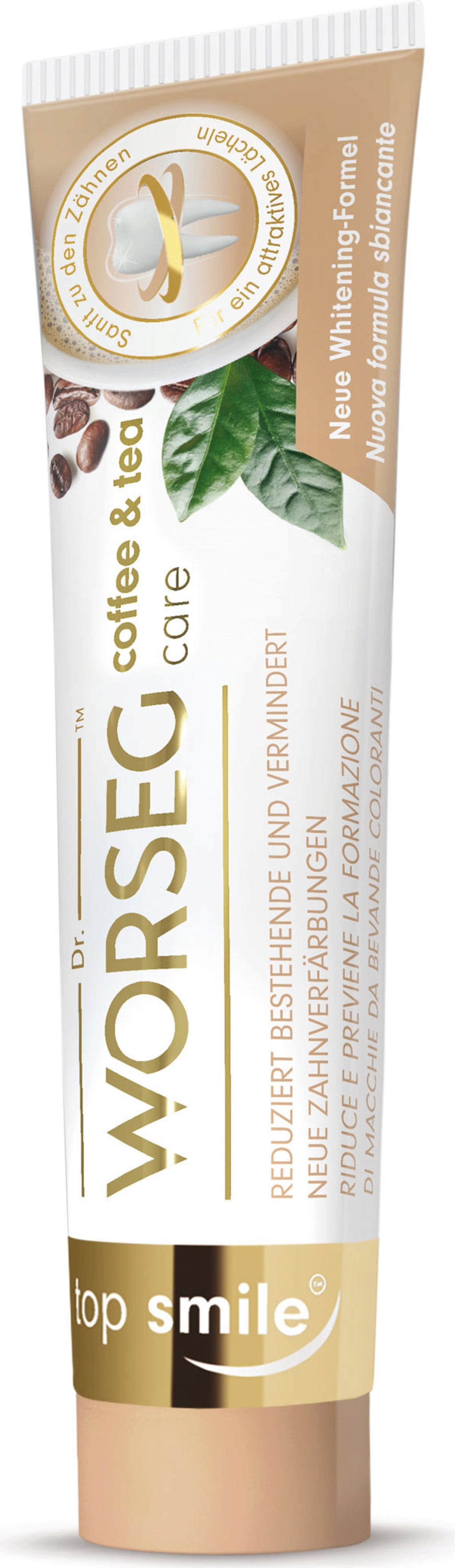 Coffee & Tea Care van top smile is een tandpasta die tanden voorzichtig zuivert van ongewenste verkleuringen door voeding. De innovatieve technologie met speciale werkstoffen helpt ook bij het verminderen van nieuwe kleuraanslag.