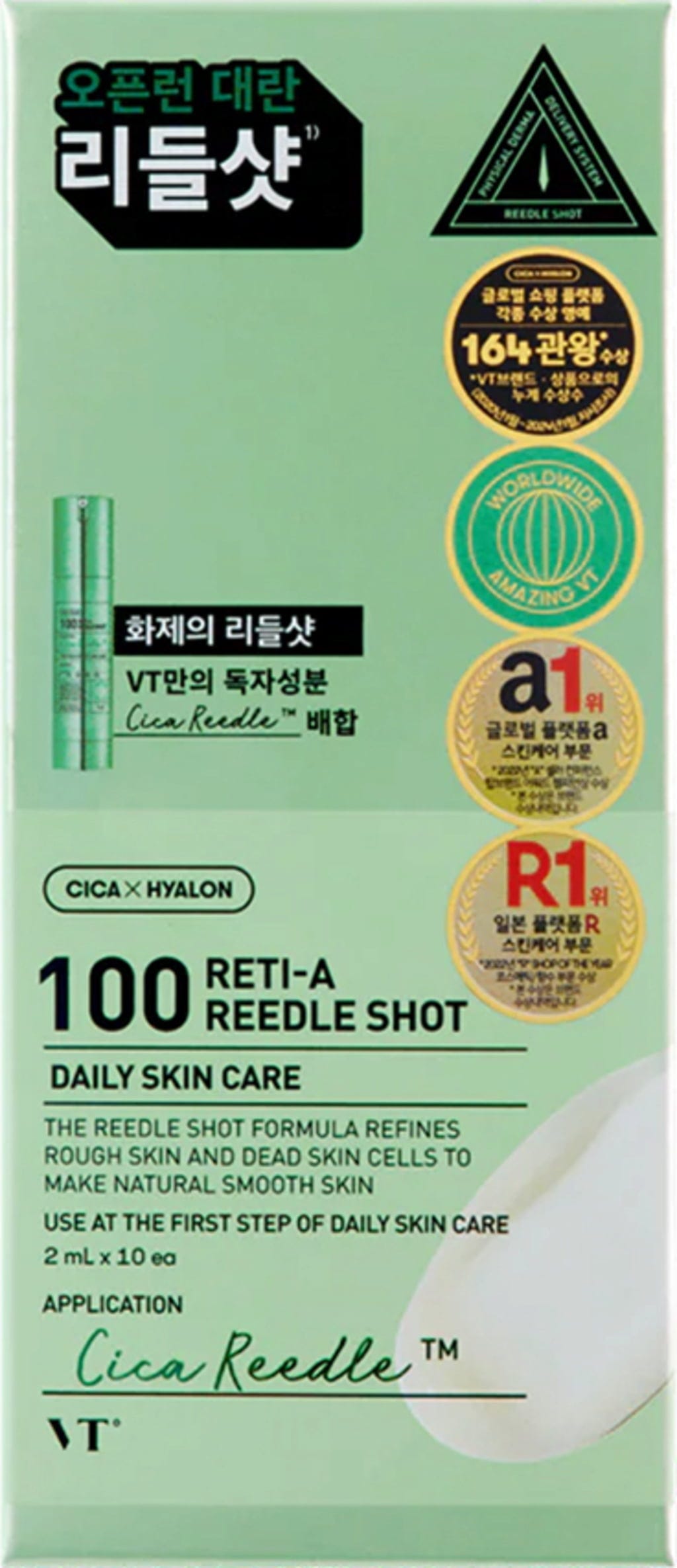 De Reti-A Reedle Shot 100 van VT Cosmetics is een innovatief serum dat het effect van retinol combineert met geavanceerde micronaalden-technologie om de huidstructuur te verfijnen en een egale, gladde huid te bevorderen. Door de synergie van Cica Reedle™ en Reti-A (Retinol & Vitamine A) worden actieve stoffen diep in de huid gebracht, waar ze de huidvernieuwing activeren en een porseleinachtig, zacht huidgevoel achterlaten. In combinatie met het plantaardige alternatief Bakuchiol wordt de huid zacht maar effectief ondersteund, wat leidt tot een egaler huidbeeld en verfijnde poriën. De microstructuur van Cica Reedle™, die 14 keer dunner is dan poriën, zorgt voor een verbeterde opname van voedingsstoffen en versterkt de effectiviteit ervan. De verzorging wordt compleet gemaakt door het gepatenteerde Cicahyalon™-complex, dat kalmerende en hydraterende eigenschappen combineert. Daarnaast zorgen polyfenolen voor een zuiverend en antioxidant effect, terwijl allantoïne zorgt voor hydraterende verzorging. De lichte emulsie-textuur trekt snel in zonder zwaar aan te voelen en is ideaal voor gebruik in de avond als een overnight-care, om de huid 's nachts te verfijnen.