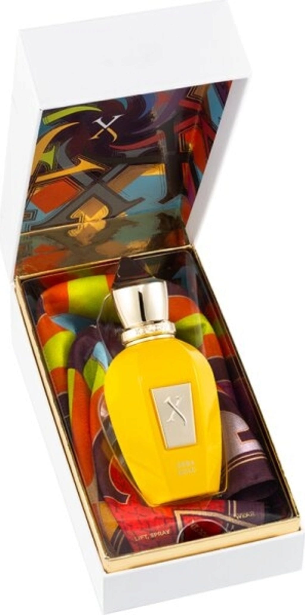 Met een exclusief ontwerp van Huis Xerjoff stralen de doeken kleurrijk met geometrische patronen die in de verpakking worden weerspiegeld.